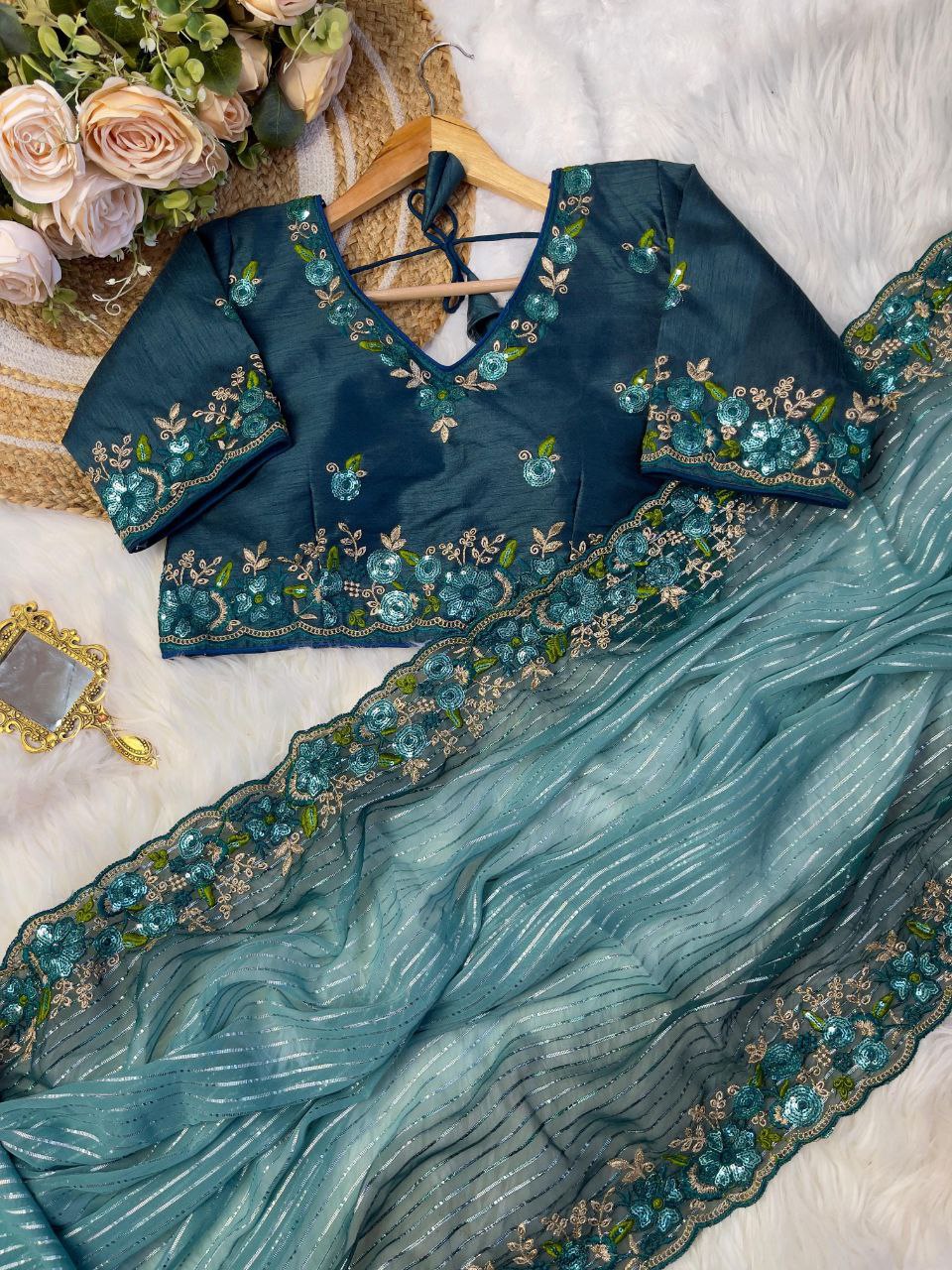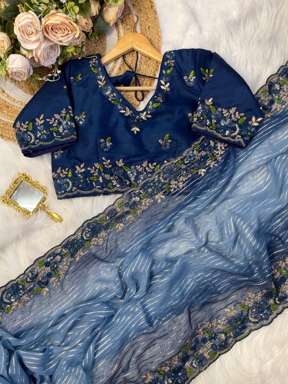 - Georgette Sequence Work Saree: Lightweight yet luxurious, with exquisite sequin details.