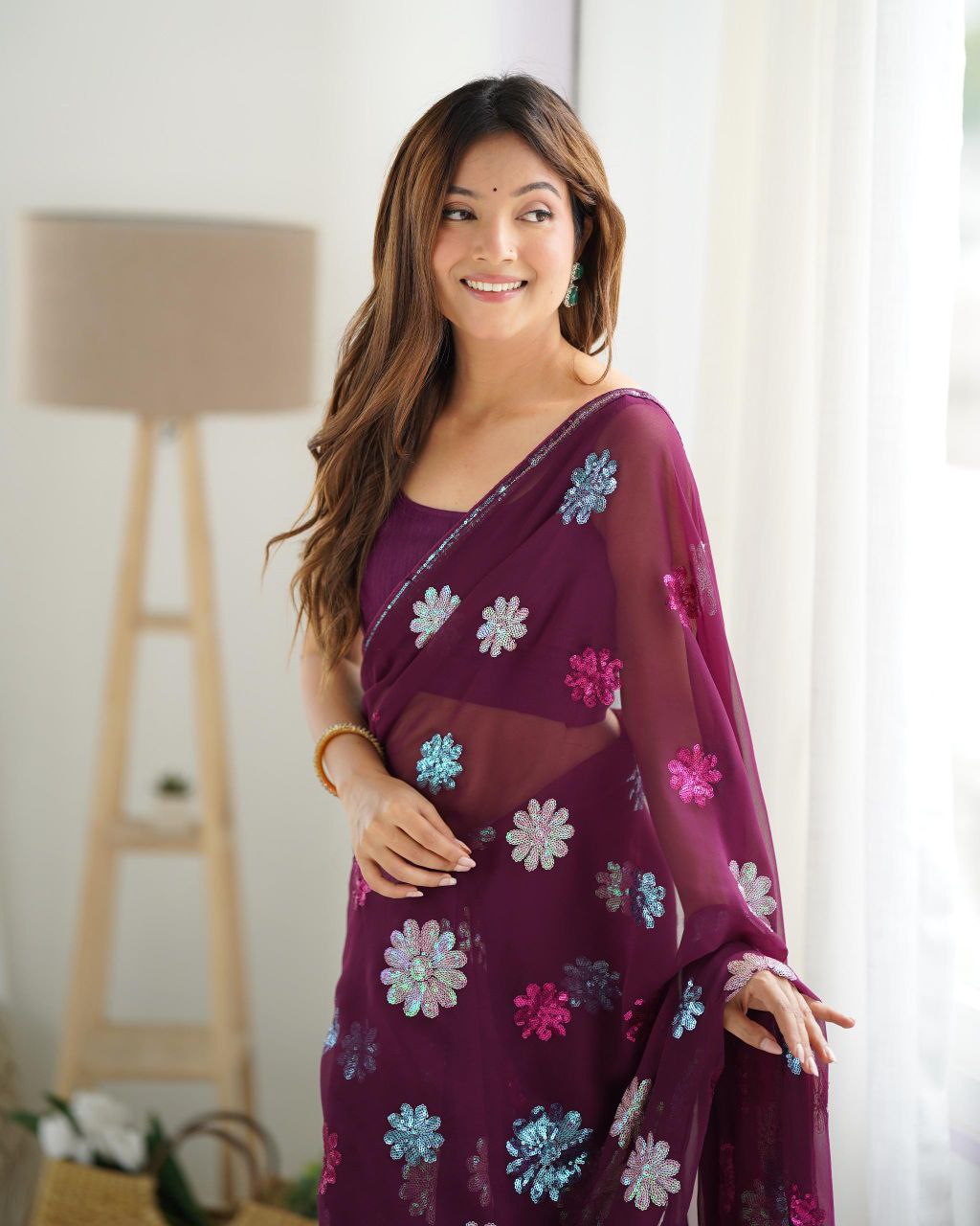 - Georgette Sequence Work Saree: Lightweight yet luxurious, with exquisite sequin details.