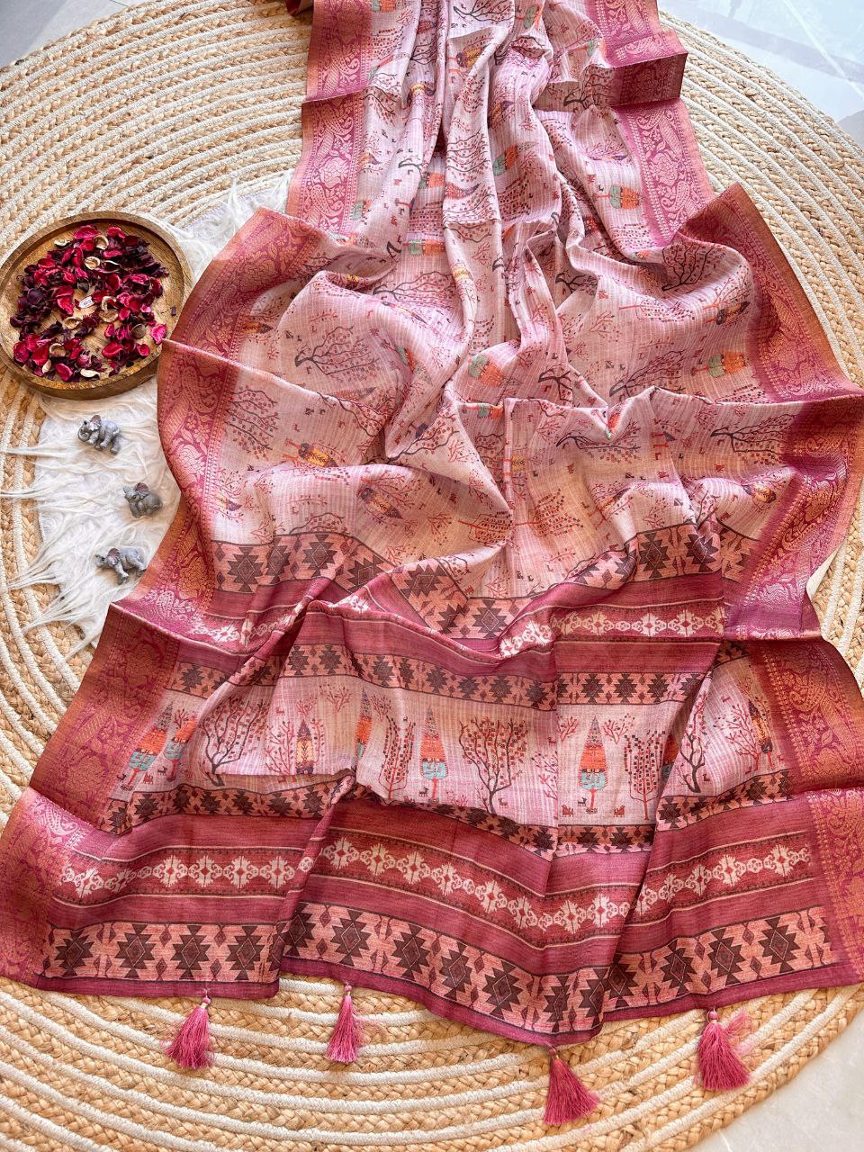 Work: Digital Print With Pure Zari Weaving Rich Pallu Saree With Beautiful Tussles In Pallu