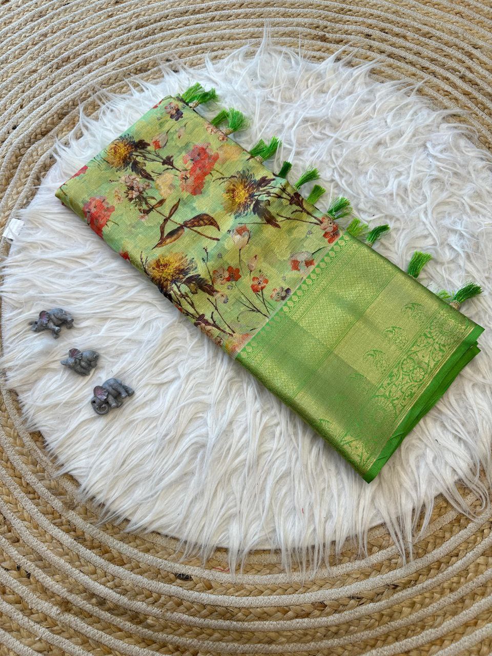 Work: Floral Digital Print With Pure Zari Weaving Rich Pallu Saree With Beautiful Tussles In Pallu