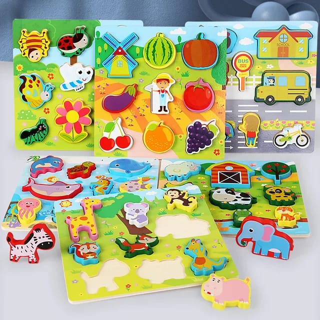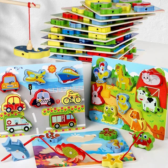 3 In 1 Wooden Animal Vehicles Stringing Shapes Magnet Matching Board Building Blocks Early Education Set
