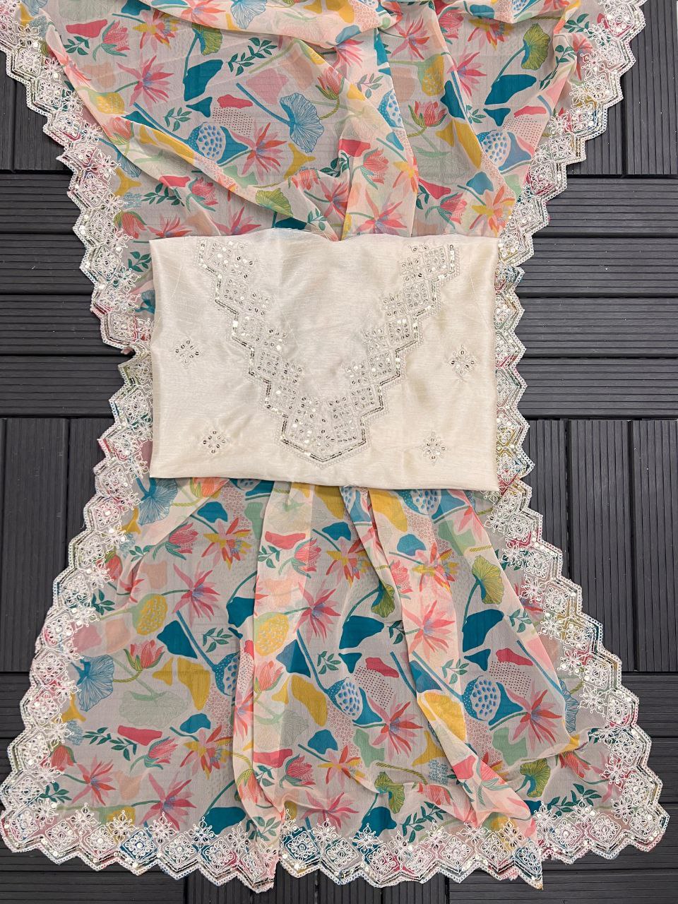 - Floral Printed Georgette Saree: Adorned with delicate floral patterns for a fresh and vibrant look.